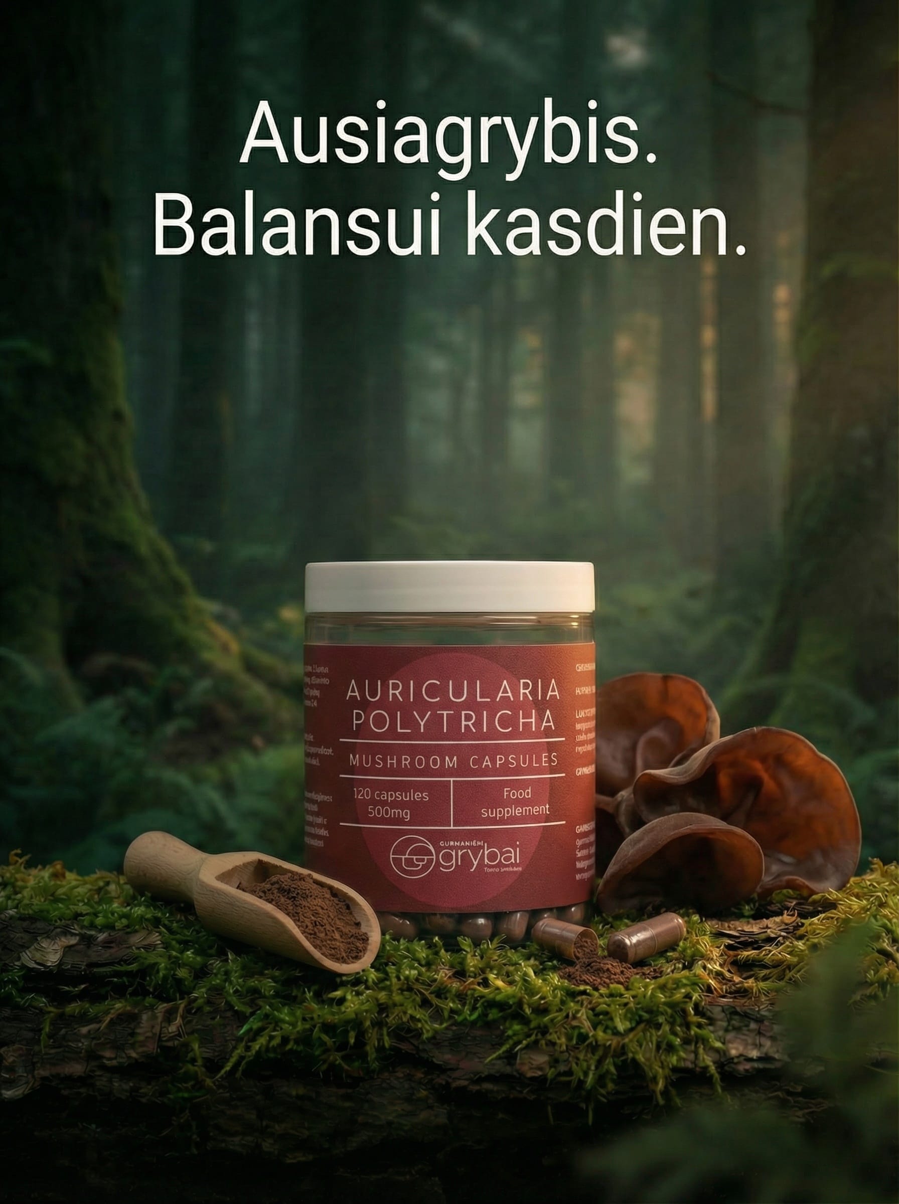 Ausiagrybio grybų miltelių kapsulės (Lt. Ausiagrybis / Lot. Auricularia polytricha) – Maisto papildas