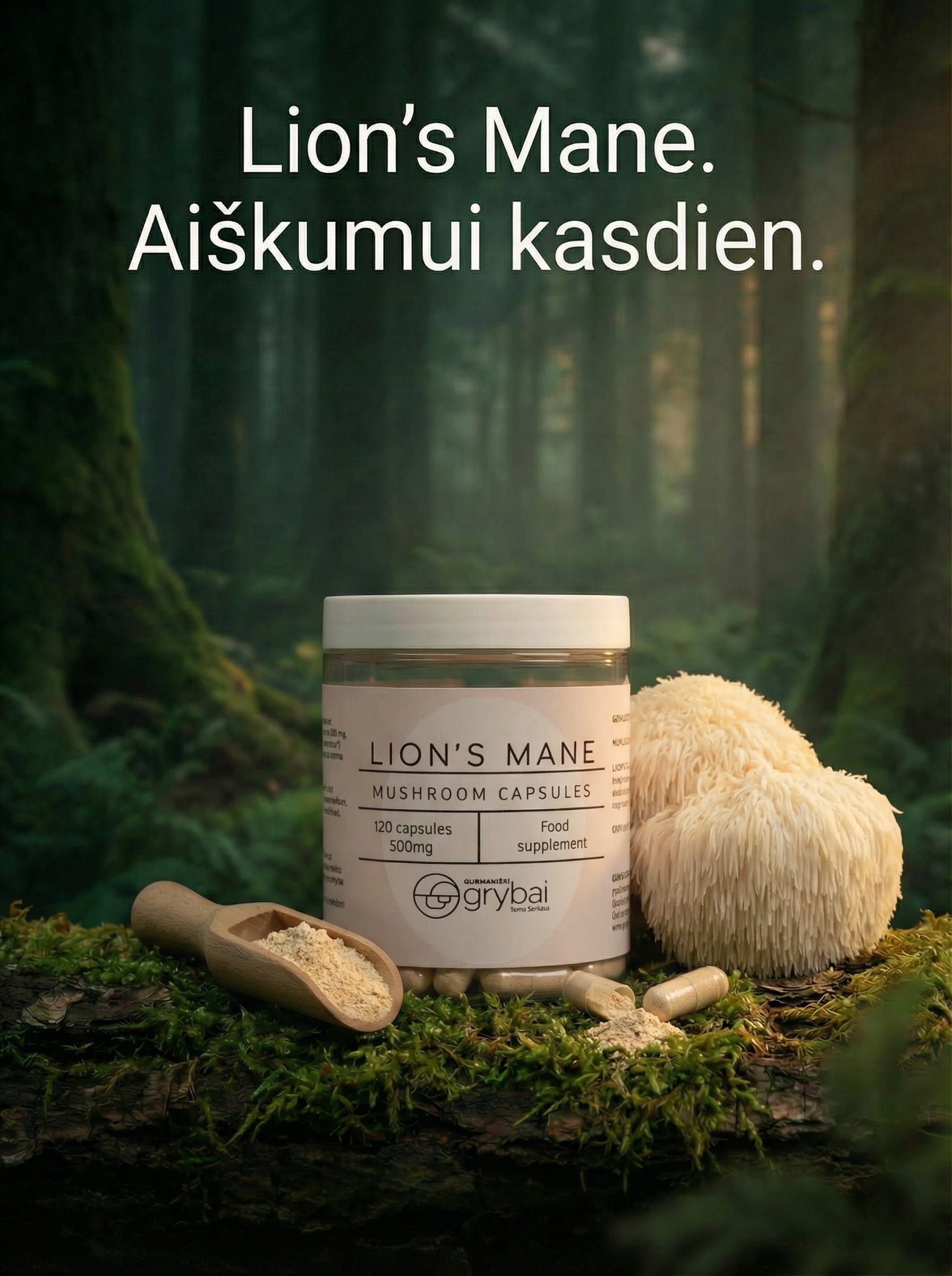 120 kapsulių (60 g.) Lion’s mane (Lt. Liūto karčių / Lot. Hericium erinaceus) grybų vaisiakūnių milteliai, hipromeliozė, karageninas (veganiškas kapsulės apvalkalas).